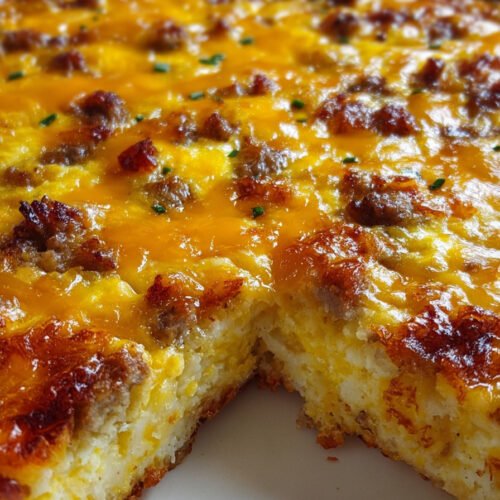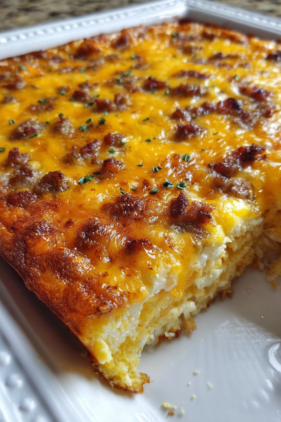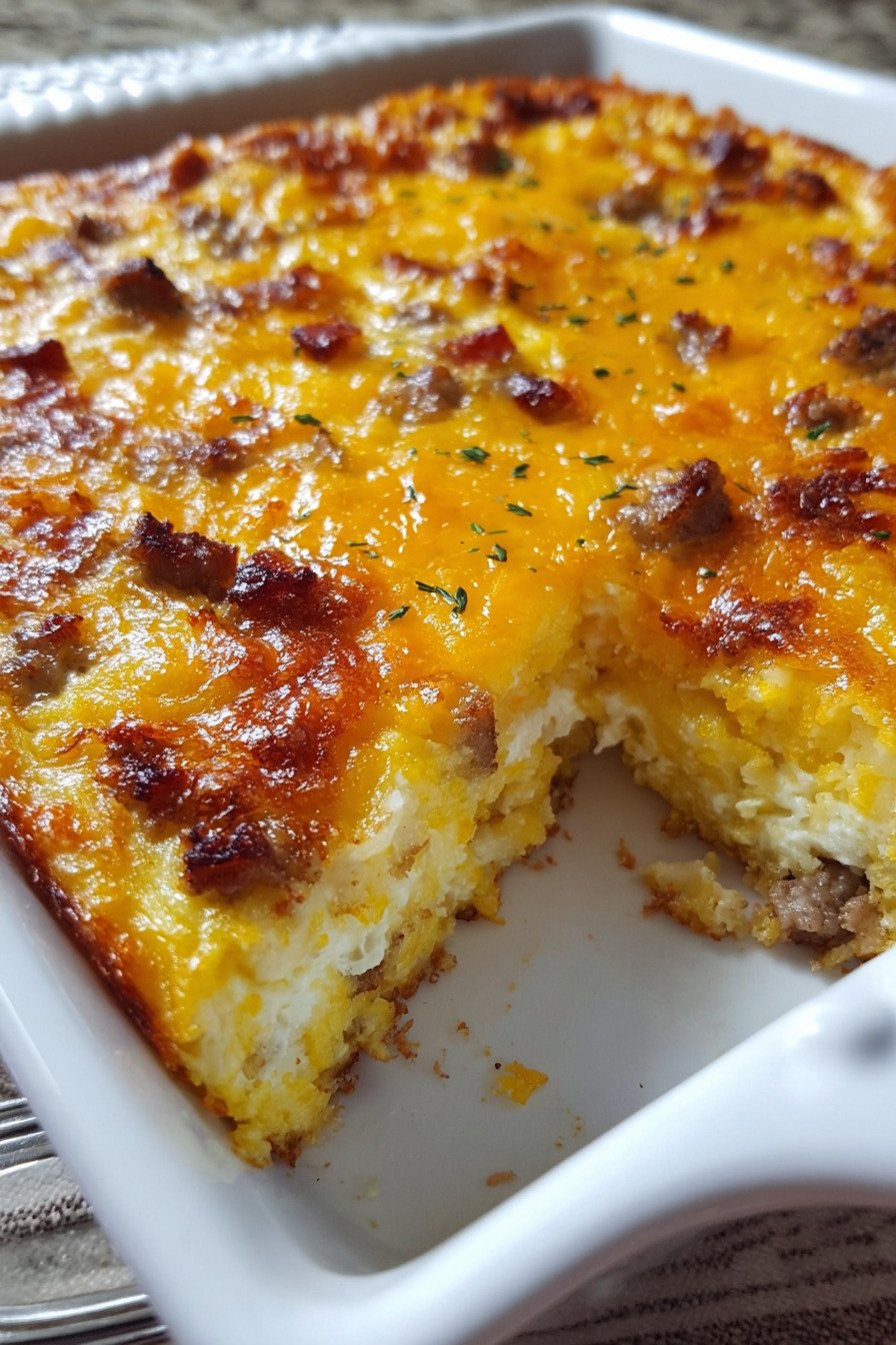 The base uses potatoes, sausage and eggs, and cheesy eggs. The mix bakes into soft layers under a light golden top. Friends ask for seconds and the pan empties fast.