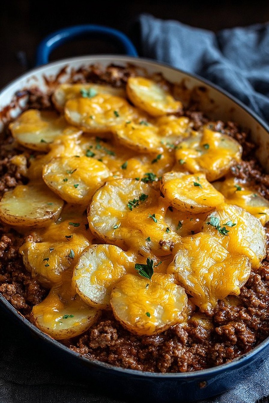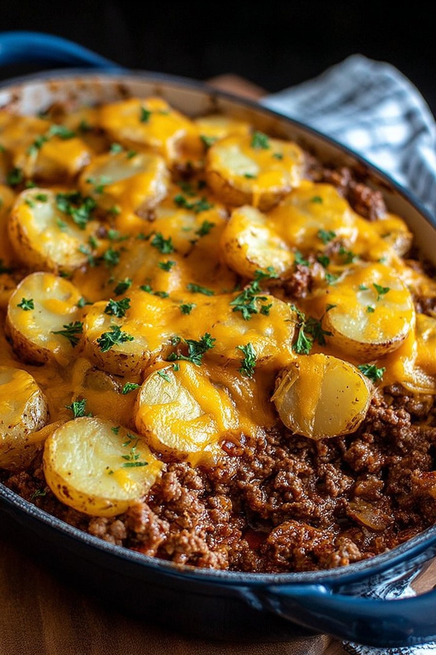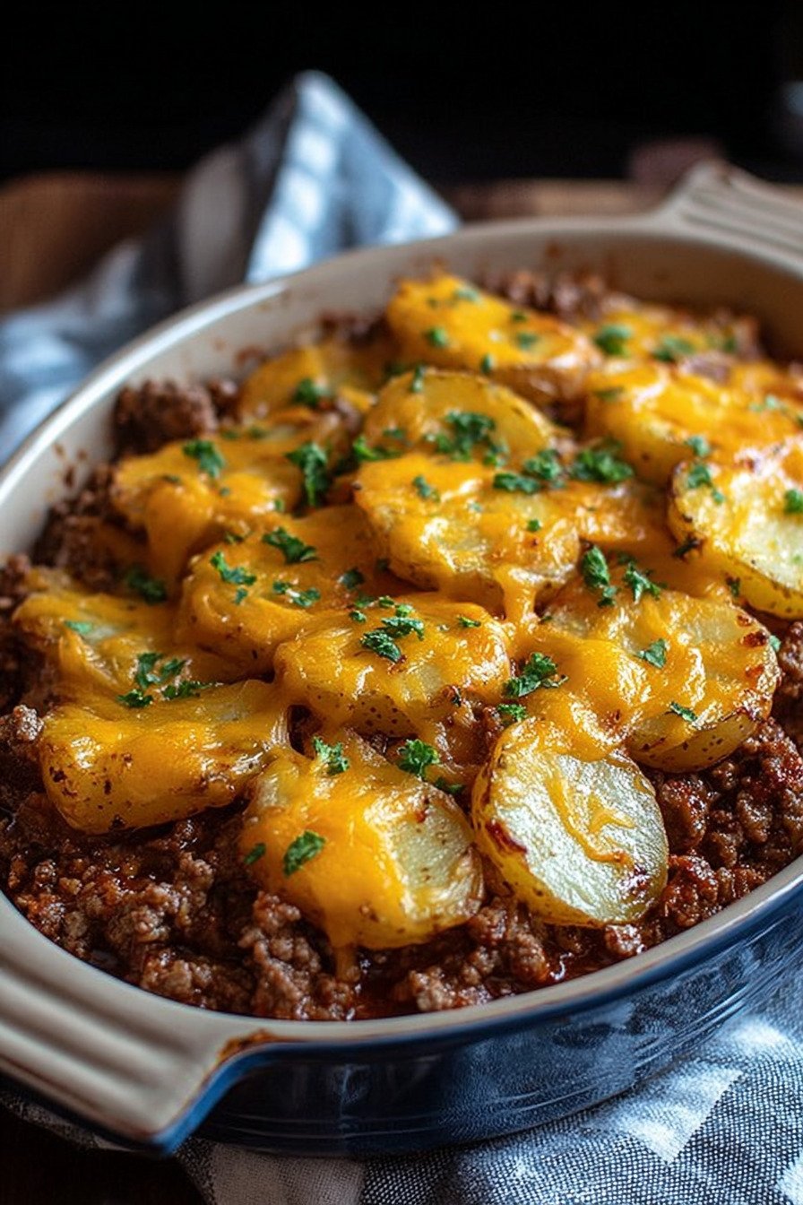 Ground Beef Ground beef provides the rich, savory base of this dish, making it hearty and satisfying while pairing perfectly with the potatoes and cheese.