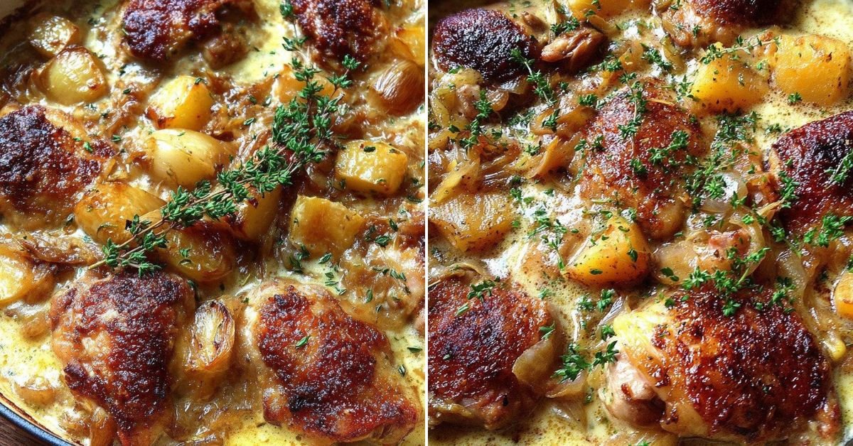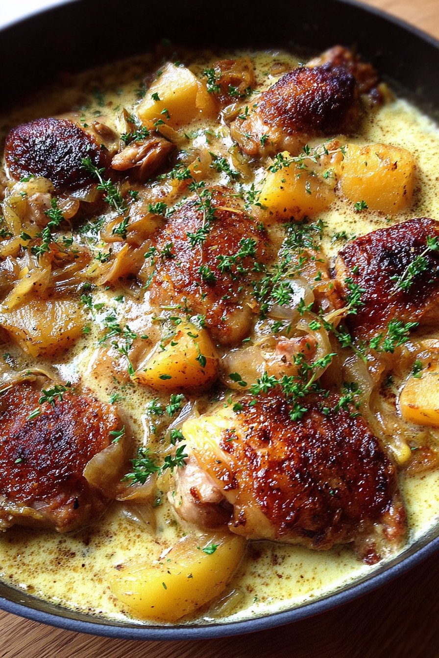 For a party I brown all the chicken in batches and chill it on a tray. The onions and apples can wait in a sealed dish. When guests roll in I combine everything and finish in the oven so the house smells dreamy.
