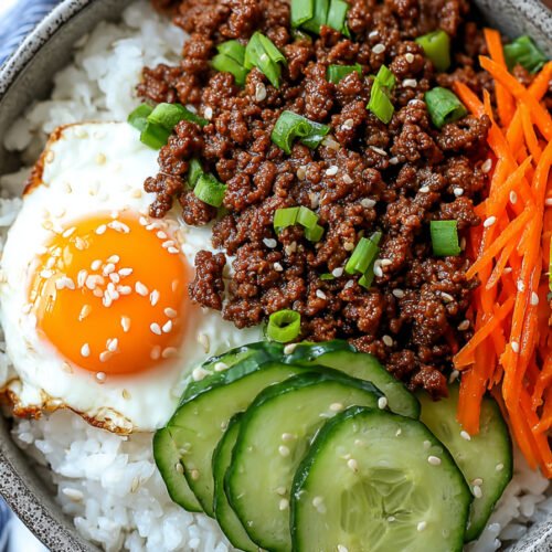 I reach for this bowl on busy nights. The beef sizzles, the sauce clings, and the rice waits. The kitchen smells warm with garlic and ginger. I smile as the pan talks in quick little pops. We cook fast. We eat slow. The meat turns glossy and tender. The scallions look bright and fresh. A soft egg on top feels like a small win. I take a bite and the sweet heat lands clean and bold. You can make it your way. Add crisp cucumber. Add steamed broccoli. Or keep it simple with rice. I use what I have and move on with my night. No fuss. Just a cozy bowl that hugs back.