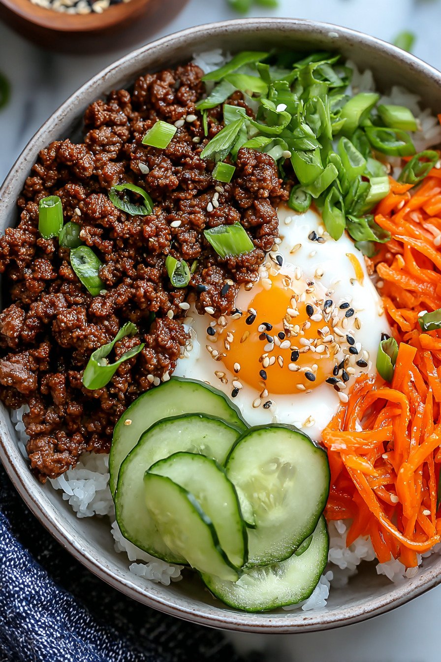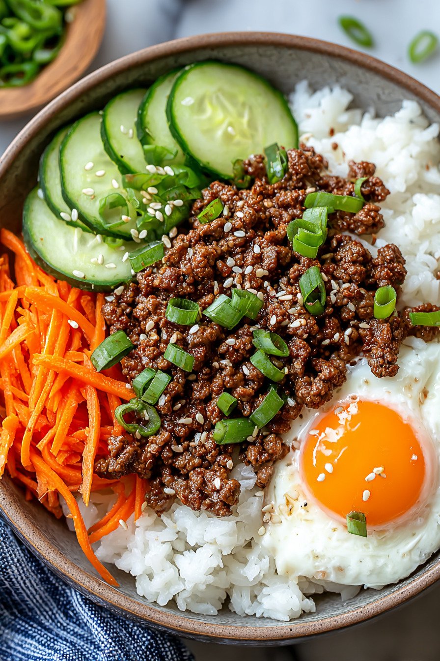 Assemble the bowls Spoon hot rice. Add beef cucumber broccoli and green onions. Top with an egg and seeds.