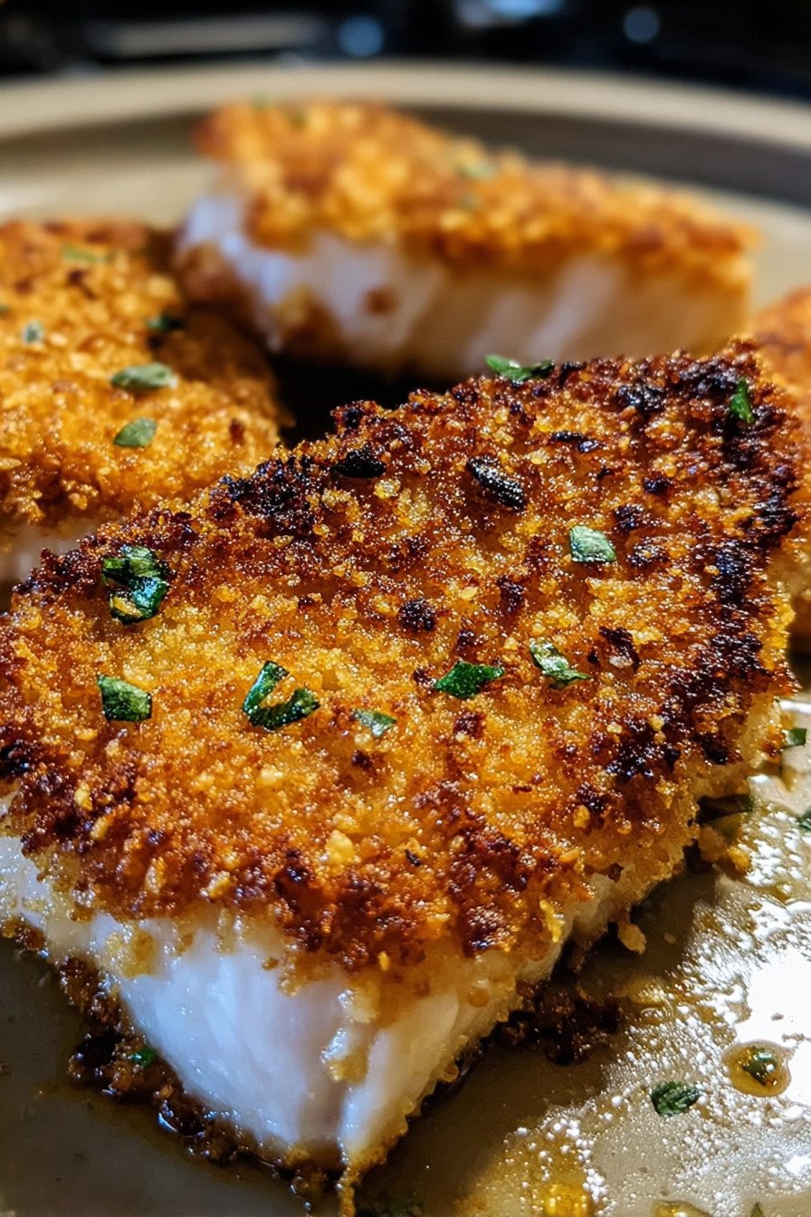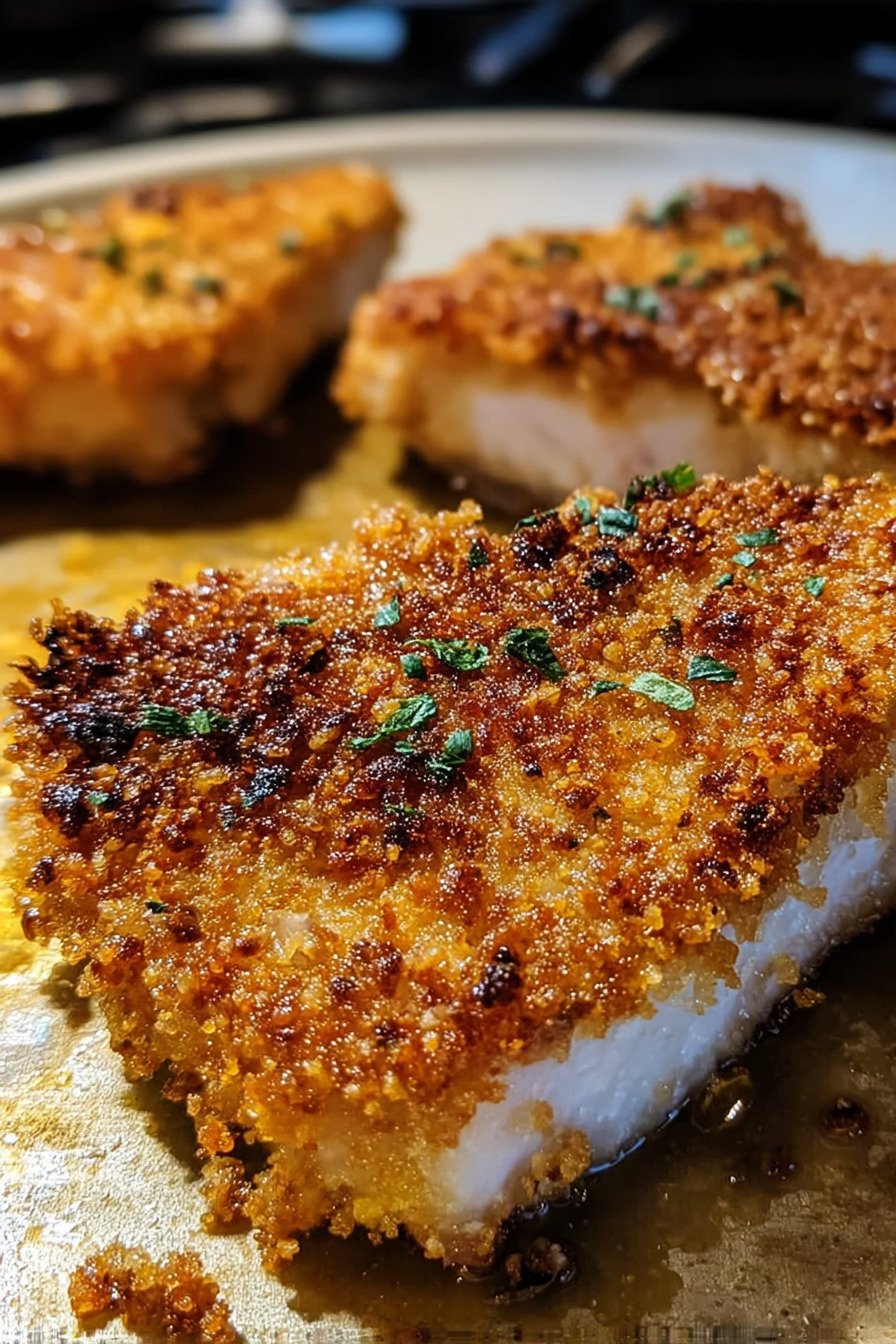 Keep the crust thin. A light coat turns crisp and lets the meat stay moist. Thick coats steam and go soft. Shake off extra crumbs before the pan