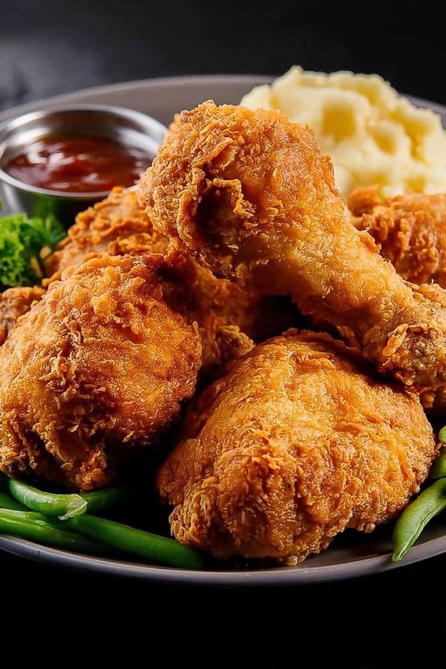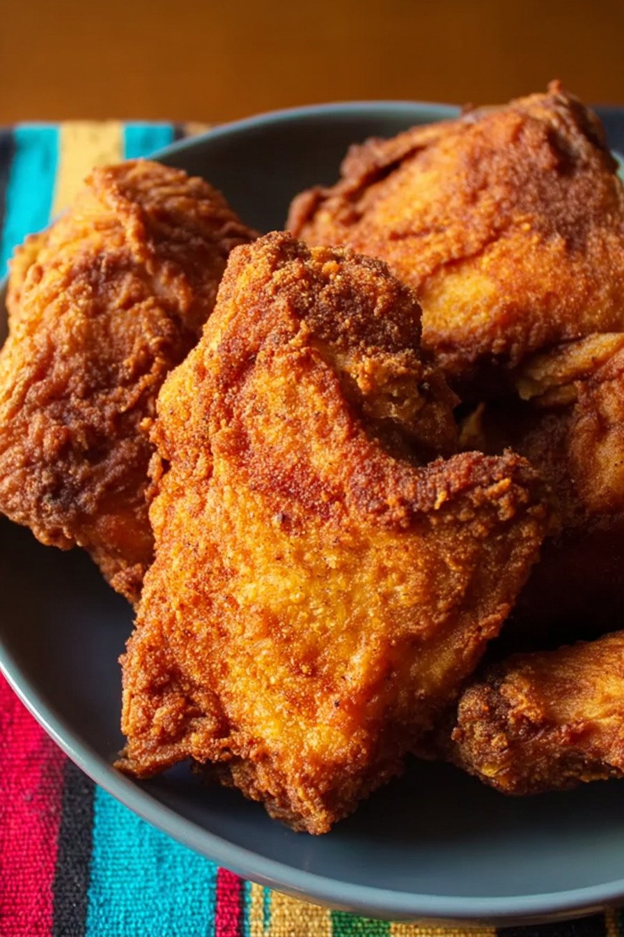 After frying, you can hold the chicken in a warm oven for a short time. Place it on a rack so air moves around it. That keeps the crust crisp.