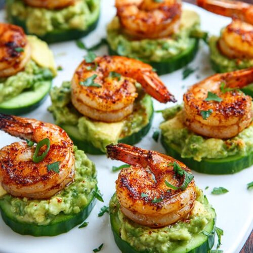 You can prep parts of this recipe in advance. Cook the shrimp, store them in the fridge, and reheat quickly in a skillet. Mix the avocado base, cover it tightly with plastic wrap pressed against the surface, and keep it chilled until ready. Slice the cucumbers fresh so they stay firm.