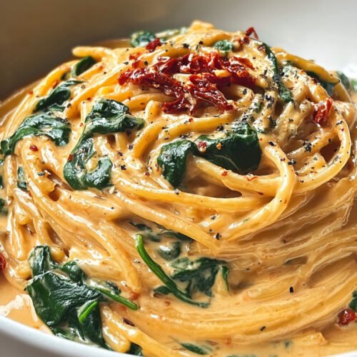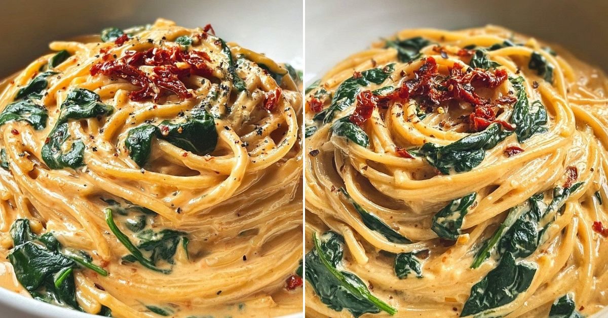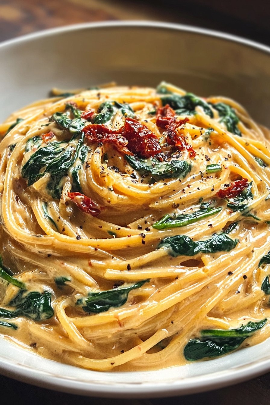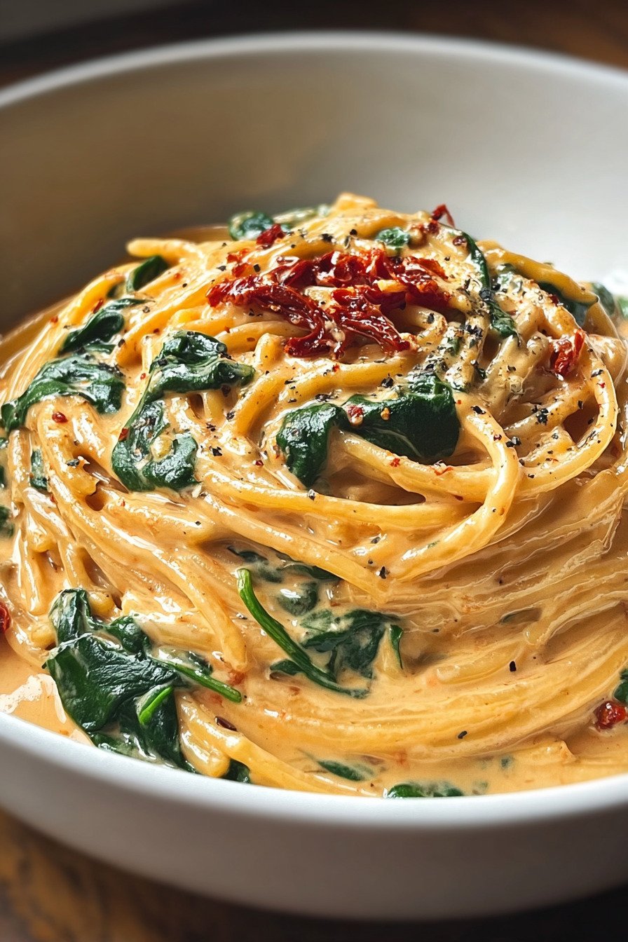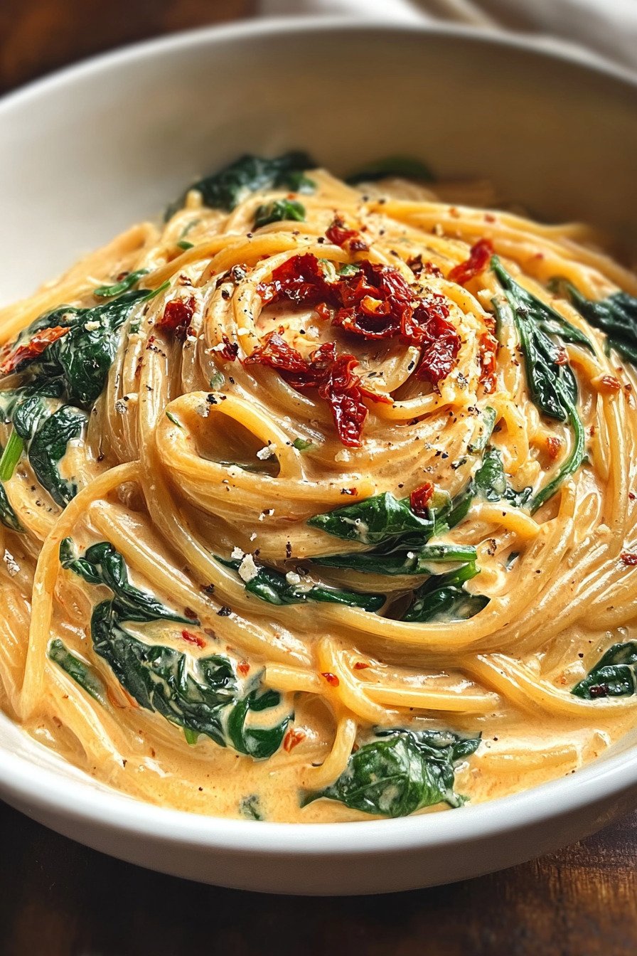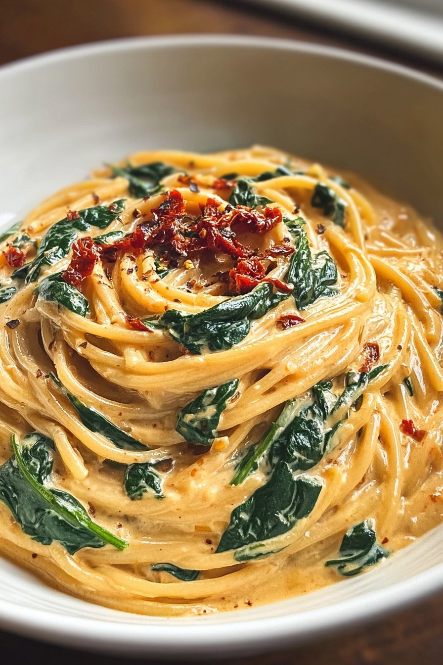 When I crave comfort that still feels light on the plate I make this pan of spaghetti with spinach and sun dried tomato cream. It sits right in that sweet spot where dinner feels cozy yet still bright. Healthy Pasta Recipes fit my week and this one delivers in minutes. We swirl tender spaghetti through a silky sauce that leans on tomato and garlic. I fold in soft ribbons of spinach so every twirl brings color and a fresh bite. You get the calm tang from sun dried tomatoes and the mellow body of cream with a touch of parmesan. It tastes like a night out yet works on a Tuesday. This is one of my go to pasta and spinach recipes and it doubles as a fast spinach pasta recipe when the day runs long. If you like pasta recipes tomato sauce with a creamy finish you will love this. The best spaghetti sauce recipe is the one you can trust on repeat and this is it. For healthy recipes pasta fans who want speed and comfort at once this joins my favorite tomato pasta recipes. Boil water set a pan and we cook.