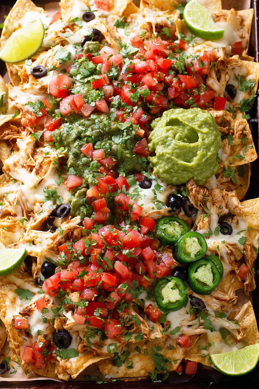 If you are hosting, assemble the chips, cheese, beans, corn, and chicken just before baking rather than hours in advance. That approach keeps the chips from softening and gives you the fresh, crisp texture that makes this homemade nachos recipe so appealing.