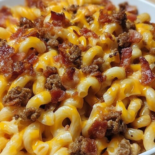 - Loaded with bacon, ground beef, cheddar cheese, and a creamy sauce that clings to every noodle.