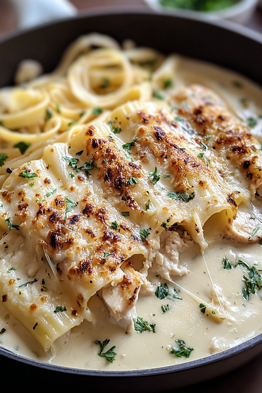You fill tender tubes with chicken and ricotta. You pour warm Alfredo on top. You slide the pan into a hot oven. The meal lands fast and cozy. The method reads simple and steady.