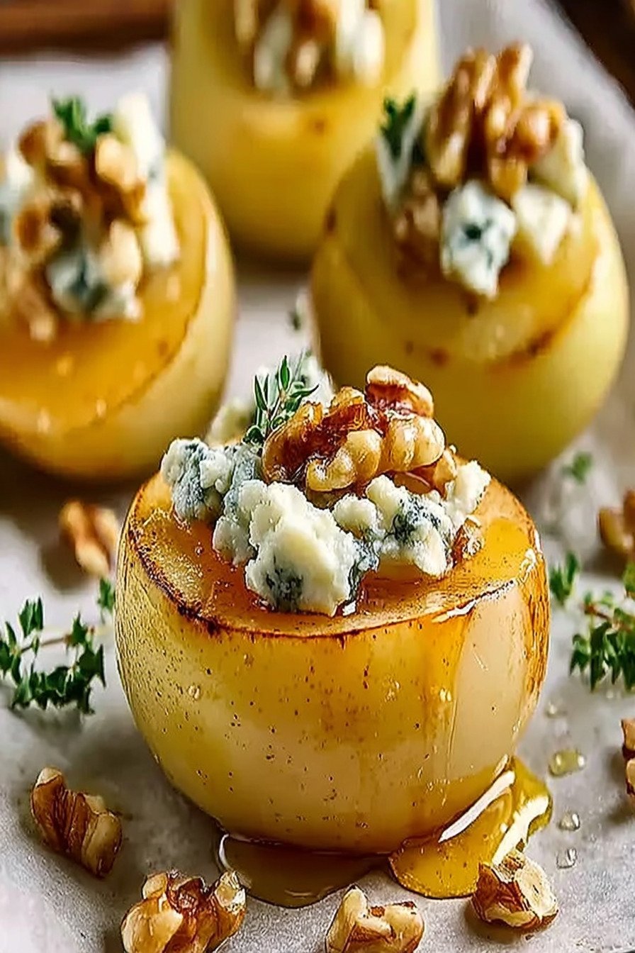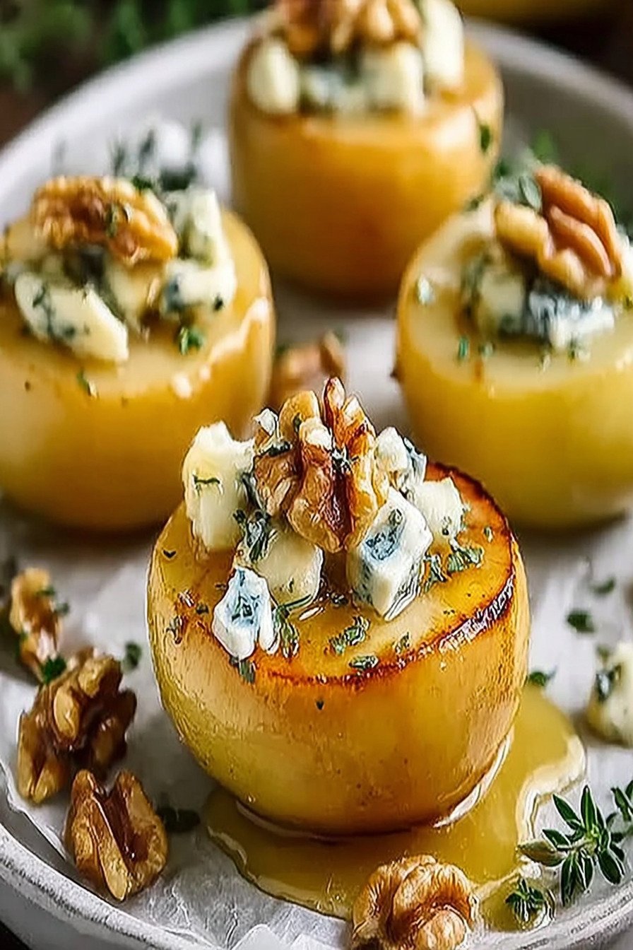 Blue cheese turns creamy as the pears soften. Honey adds a warm gloss. Walnuts toast and lend a nutty bite. The bite lands sweet then salty then crisp. It eats like a smart little party starter and it costs little time.