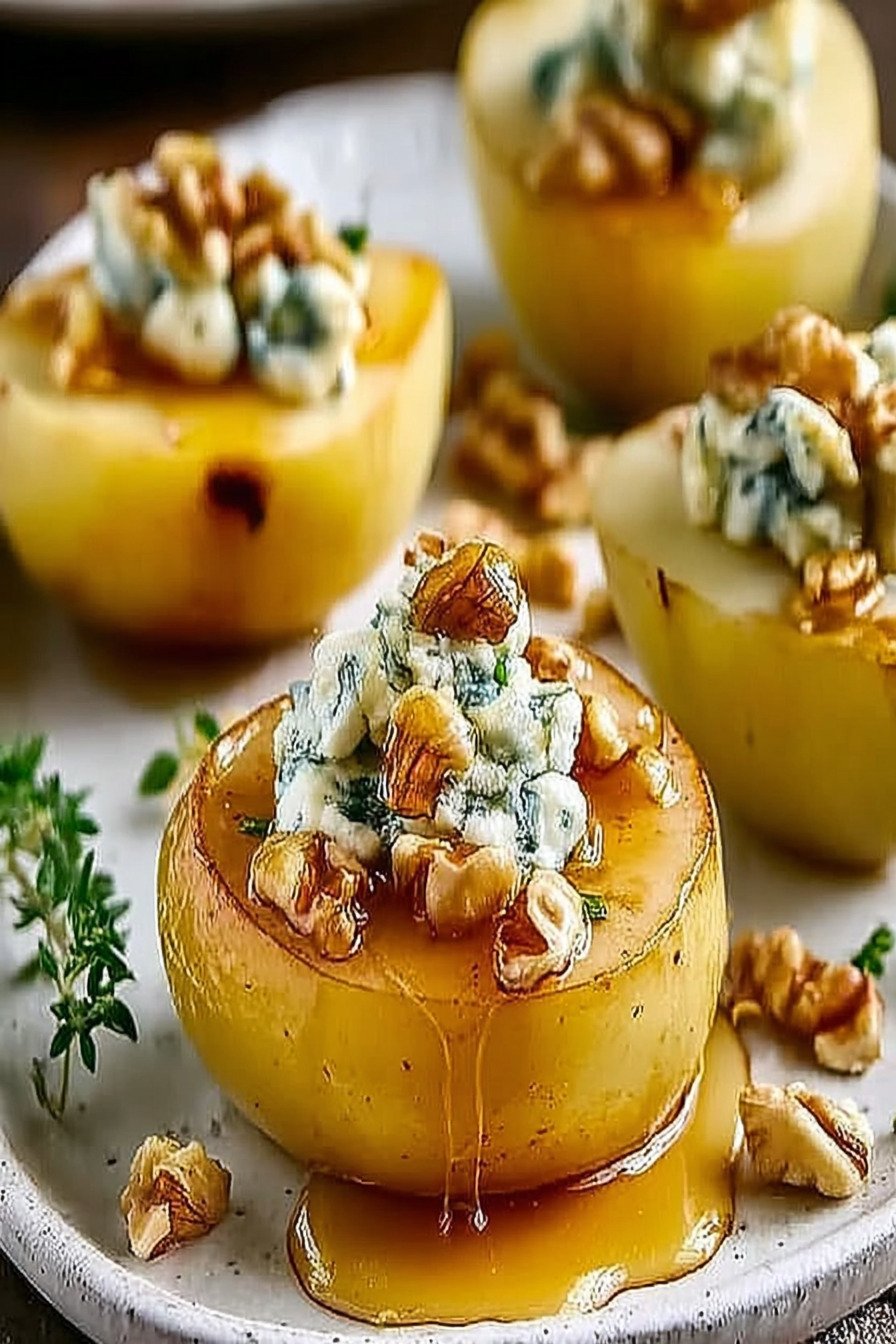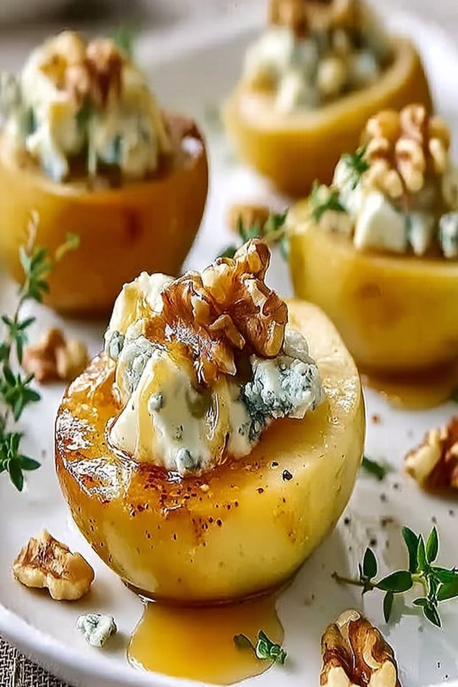 Plate warm. Blue cheese melts best over hot fruit. Honey flows and shines. The contrast lands strong and clean. This approach fits party appetizers and keeps guests happy.