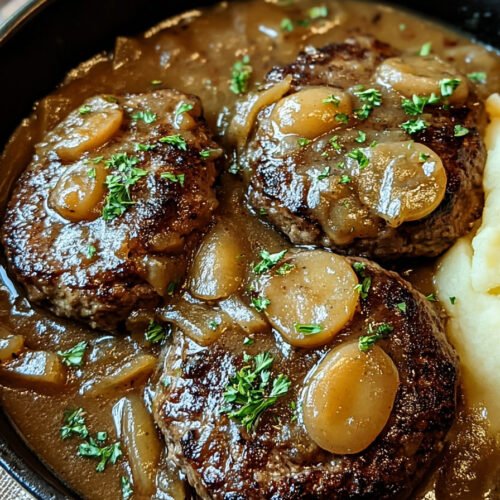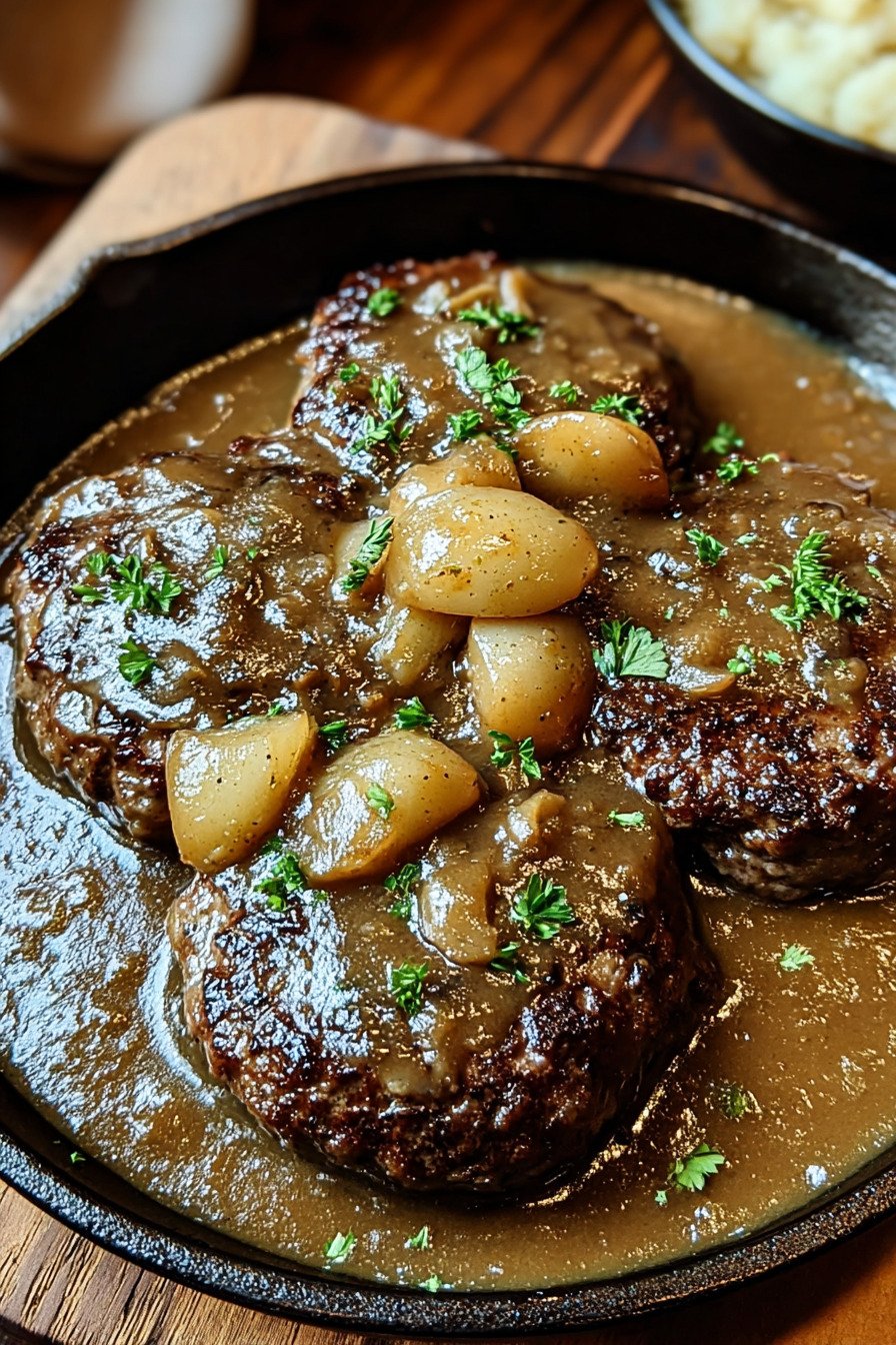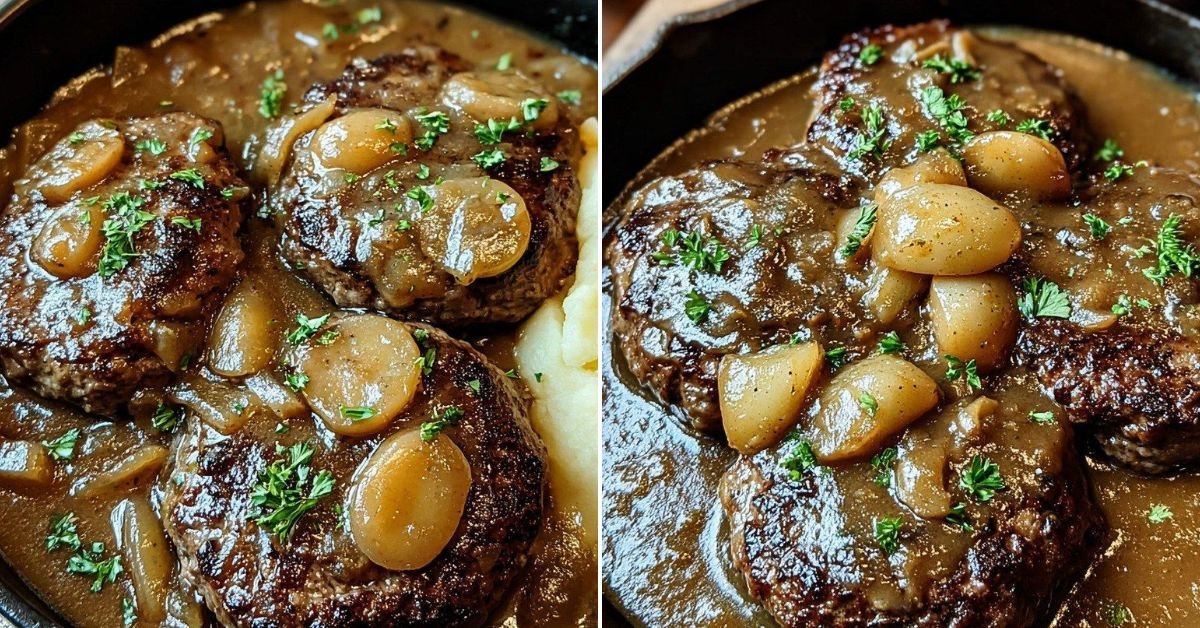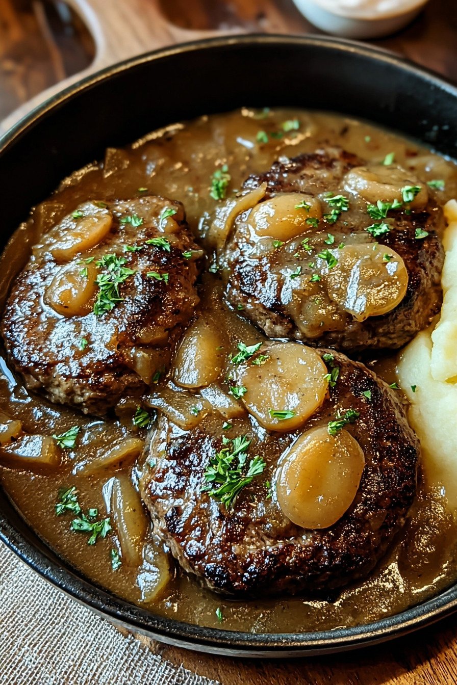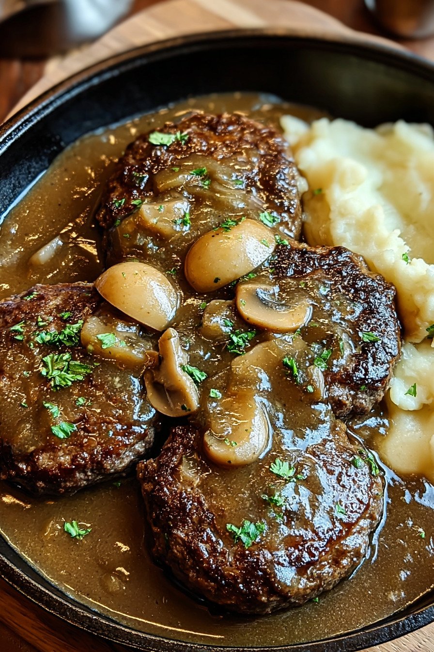 I call this salisbury steak recipe comfort with a skillet and a spoon. The patties stay tender. The gravy turns silky. The onions go sweet. You sit down and it feels like home. I cook this on busy nights and on slow Sundays. It never lets me down.