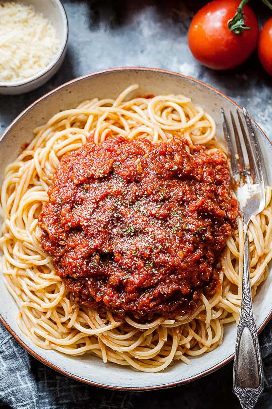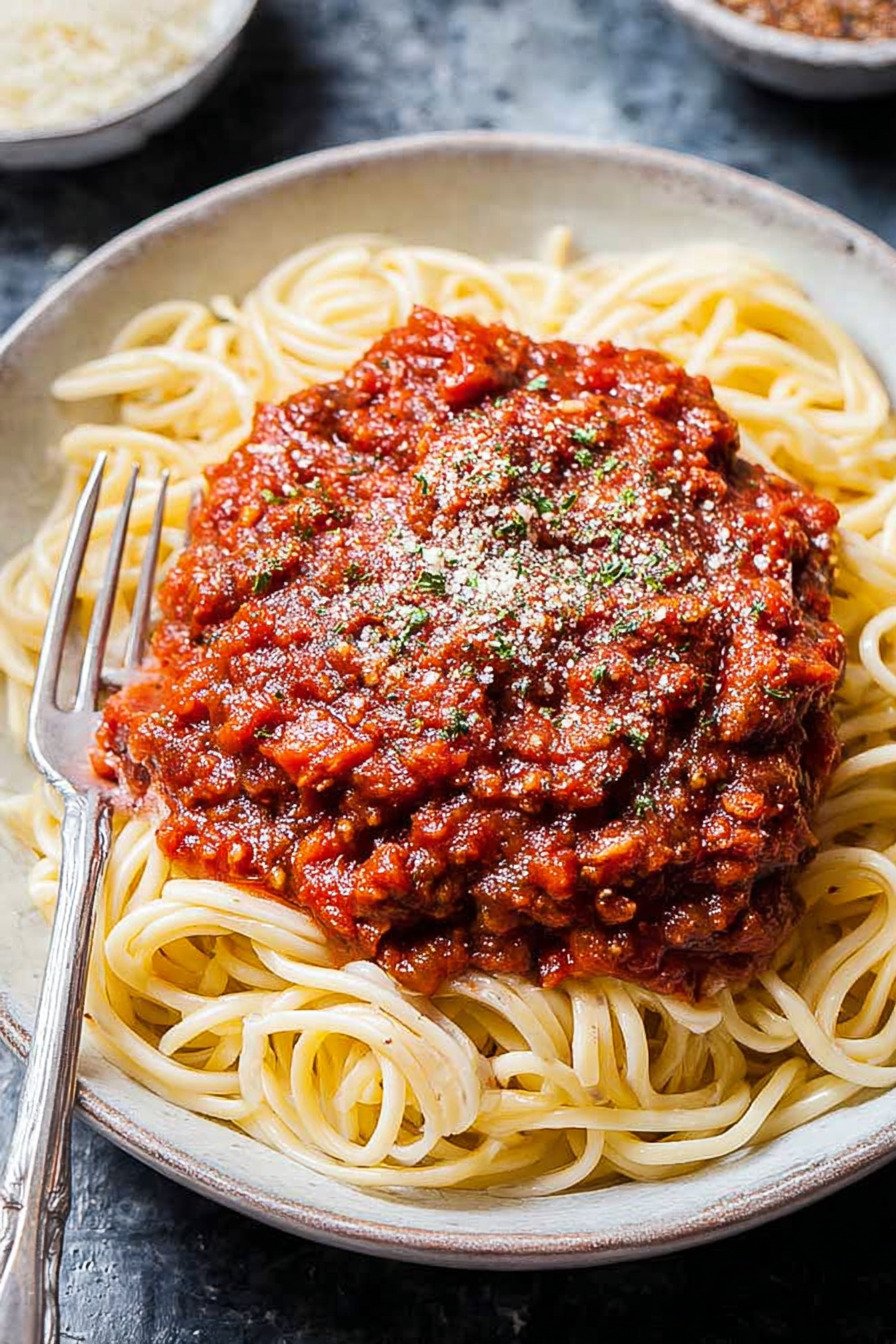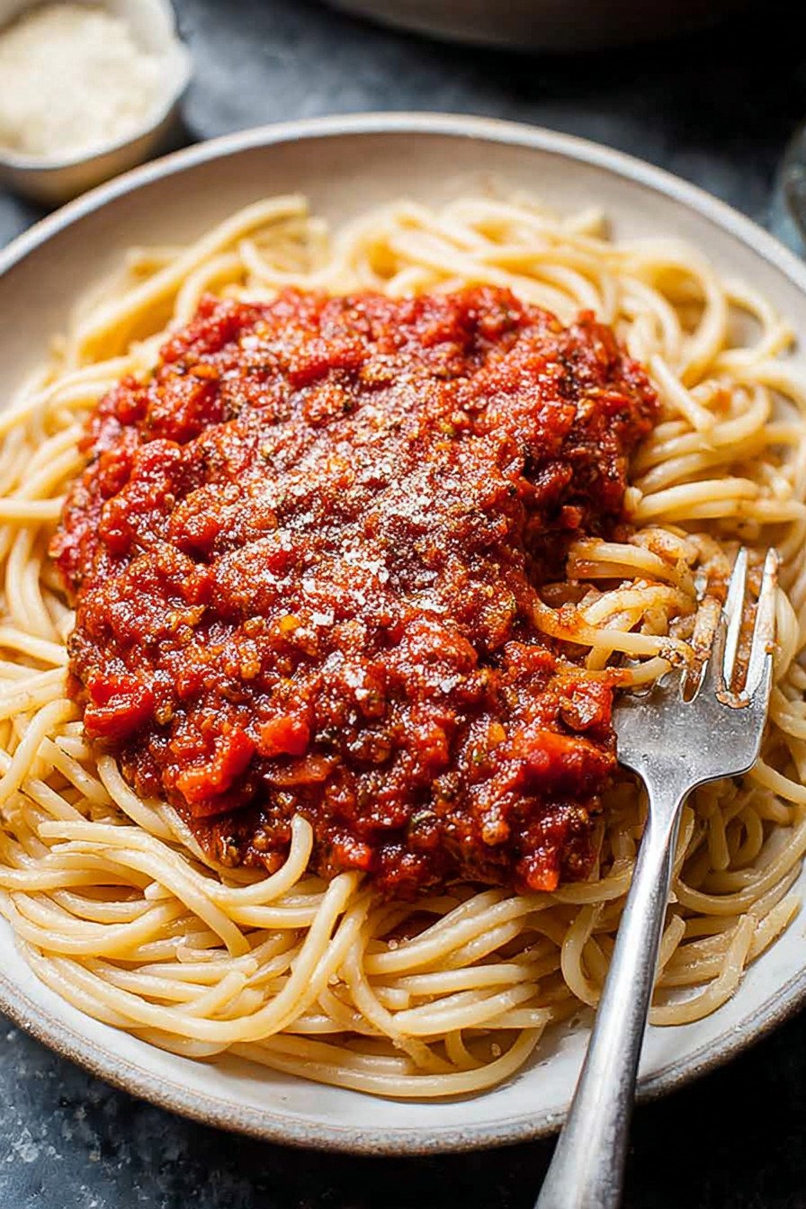 One cup holds about one hundred eighty calories with modest fat from olive oil and natural sugar from tomato. Fiber sits near four grams and protein near five. Sodium depends on the salt you add. Use less if you plan to top the pasta with a salty cheese. This sauce fits many spaghetti dishes and leaves room for sides like salad or garlic bread.