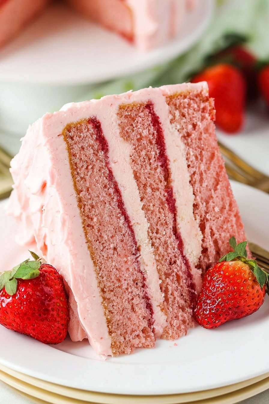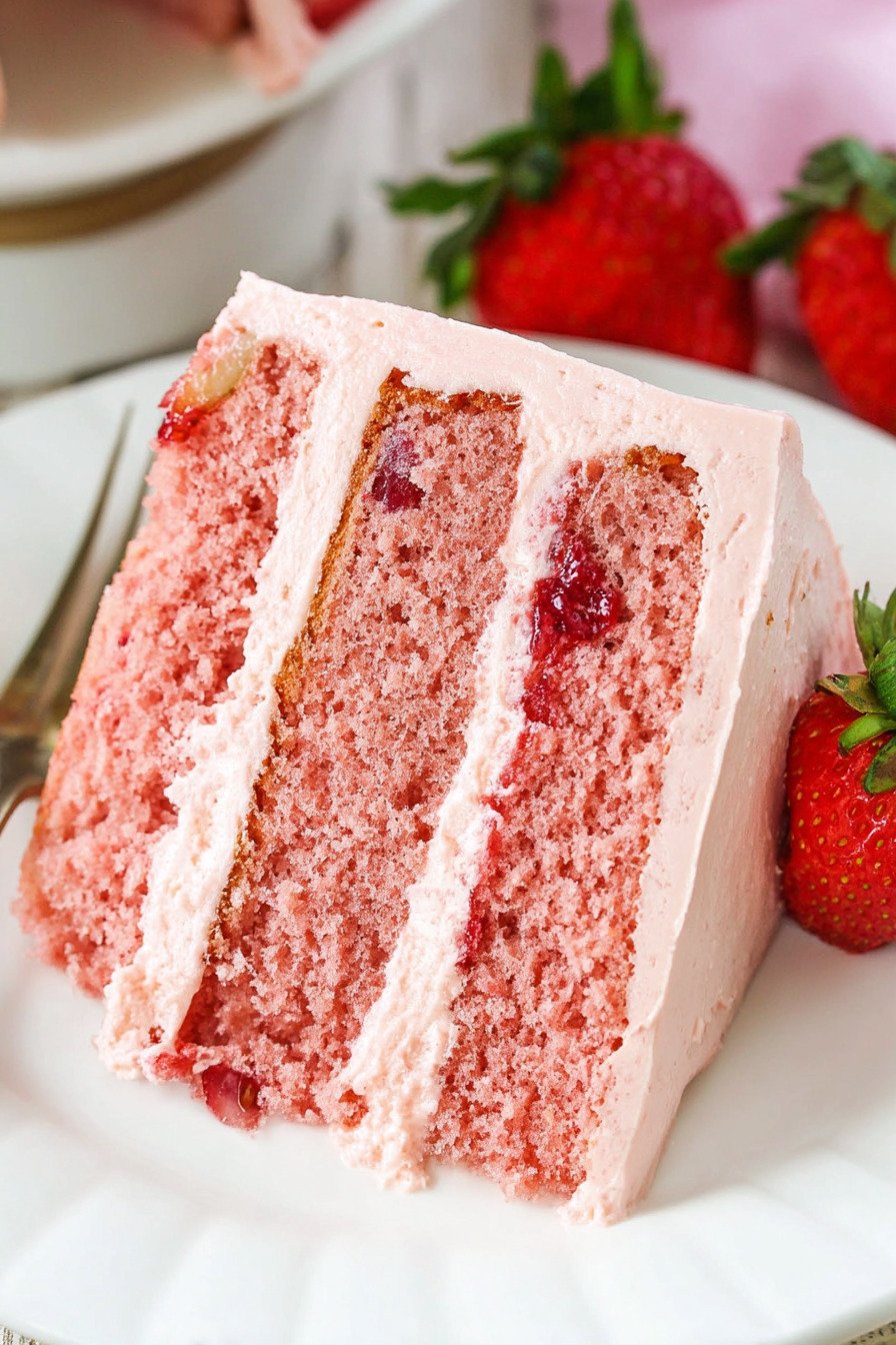 Late night treat. A small wedge with tea feels perfect. You taste strawberry first then vanilla then a light tang from the frosting. That order tells you the balance sits right.