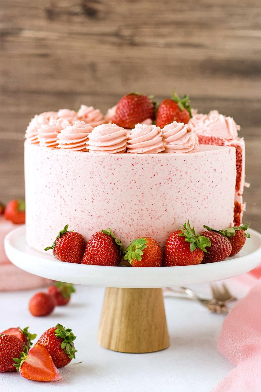 I bake layers one day early. I wrap them once cool. The texture stays soft and the flavor deepens by morning. A strawberry cake from scratch can rest and still slice like a dream.
