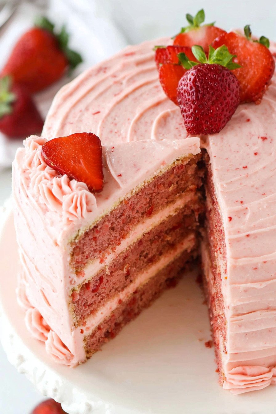 This strawberry cake starts with reduced berry puree. Strawberry cake lovers want real fruit in the crumb. I stir in a touch of vanilla and a little lemon for lift. Two pans give layers and room for cream cheese frosting.
