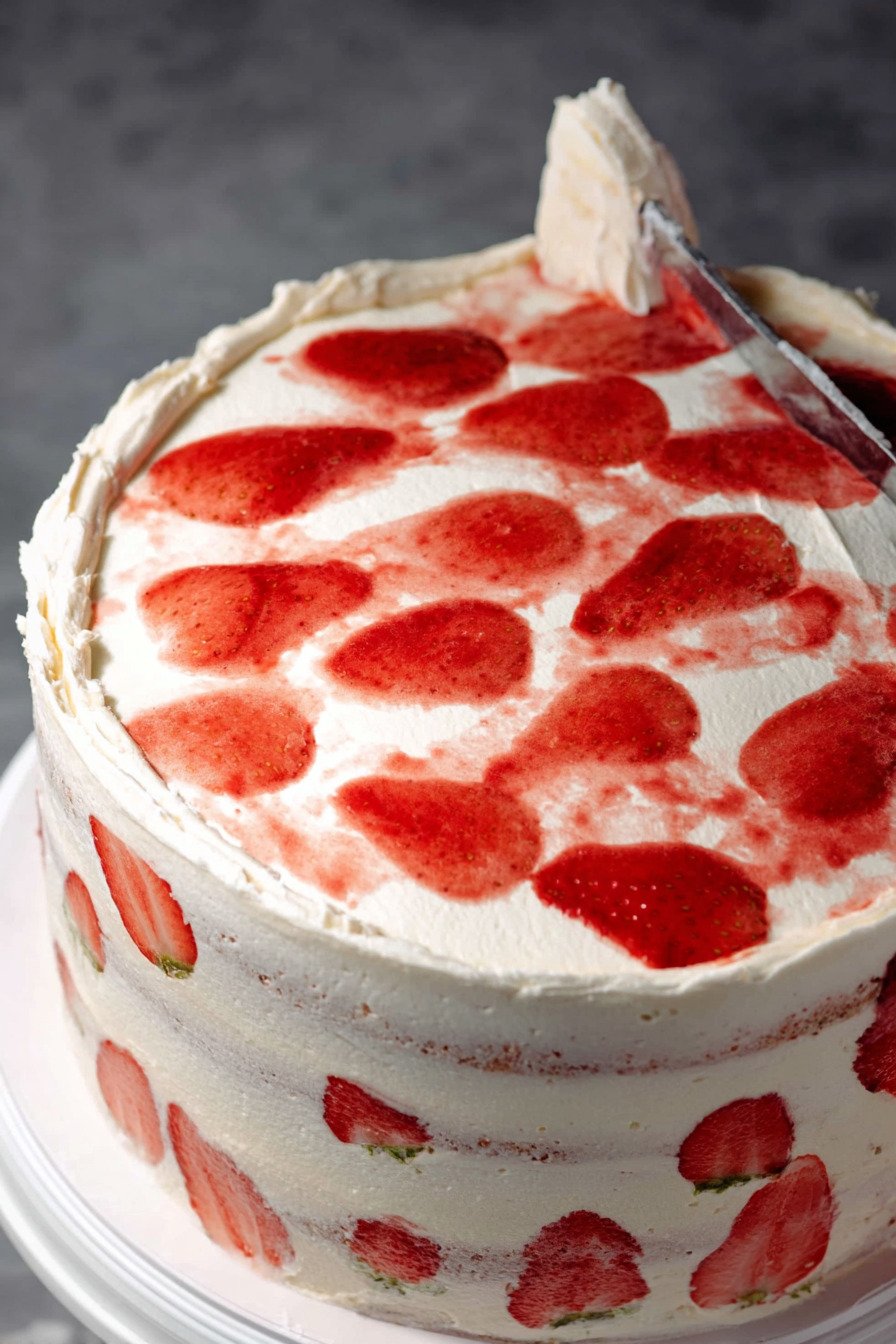 Step five Split the cake into even layers. Brush syrup. Spread cream. Tuck in berries. Repeat. Chill the strawberry cake so the crumb and cream set for clean slices.