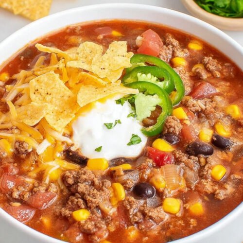 I make taco soup when the day feels long and the sink keeps winking at me. This pot leans bold and warm. We use pantry cans and ground beef, stir once, and then the room starts to smell like home. It hits that perfect spot between stew and soup, so every spoon lands rich but light. You asked for a simple path, so I keep it clear. This recipe for taco soup skips fuss and brings a little fun. I learned the rhythm back when lunches ran late at Elena Cooks. Friends came by, the pot went on, and talk got loud. The soup did the rest. Our taco soup loves a crowd and plays nice with toppings. It fits busy nights and slow Sundays. I pair it with cornbread or a taco bread recipe when I have extra time. If you want a fast week, try this 7 can taco soup recipe easy. It reads like your favorite soup recipe and joins your list of taco recipes. Call it soup, call it comfort, then call me for seconds.