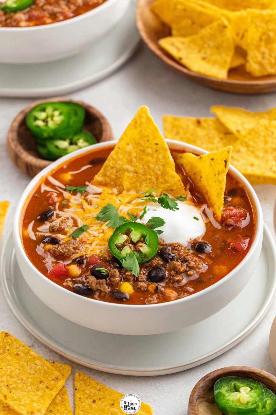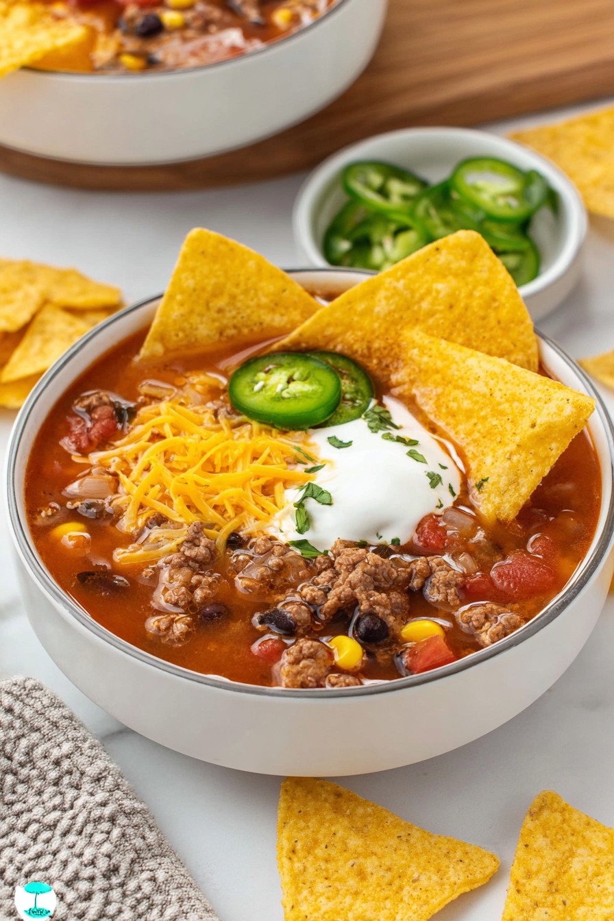 Serve with fresh toppings to wake the bowl. A quick squeeze of lime and a small spoon of sour cream bring balance. This keeps the quick taco soup bowl lively.