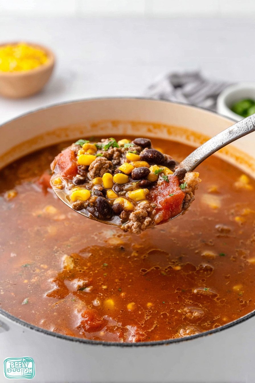 Brown the beef well so the fond forms. That dark layer lifts into the broth and makes a hearty taco soup. Stir with a flat spoon to scrape the base.