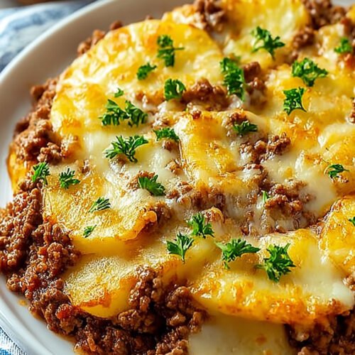 In a greased baking dish, layer half the potato slices, followed by the beef mixture.