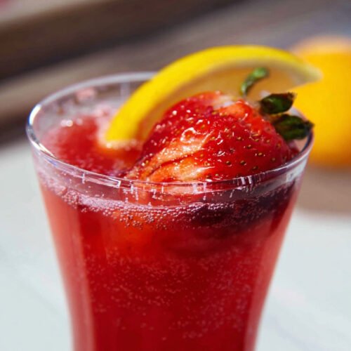 Pour the strawberry puree into a pitcher and add chilled hibiscus tea.